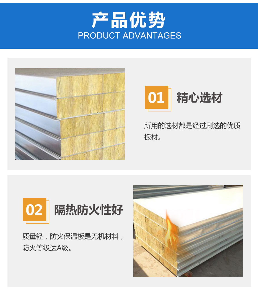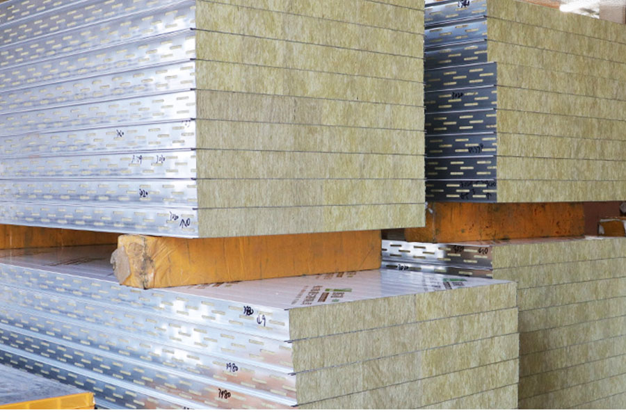 巖棉彩鋼板其芯材是以玄武巖及其它天然礦石等為主要原料,經高溫熔融成纖維,加入適量粘結劑,固化加工而制成的。是同類(夾芯板系列)中耐火性能最強的一種新型防火板材。