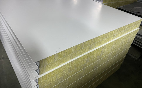 巖棉彩鋼夾芯板其芯材是以玄武巖及其它天然礦石等為主要原料,經高溫熔融成纖維,加入適量粘結劑,固化加工而制成的。是同類(夾芯板系列)中耐火性能最強的一種新型防火板材。
